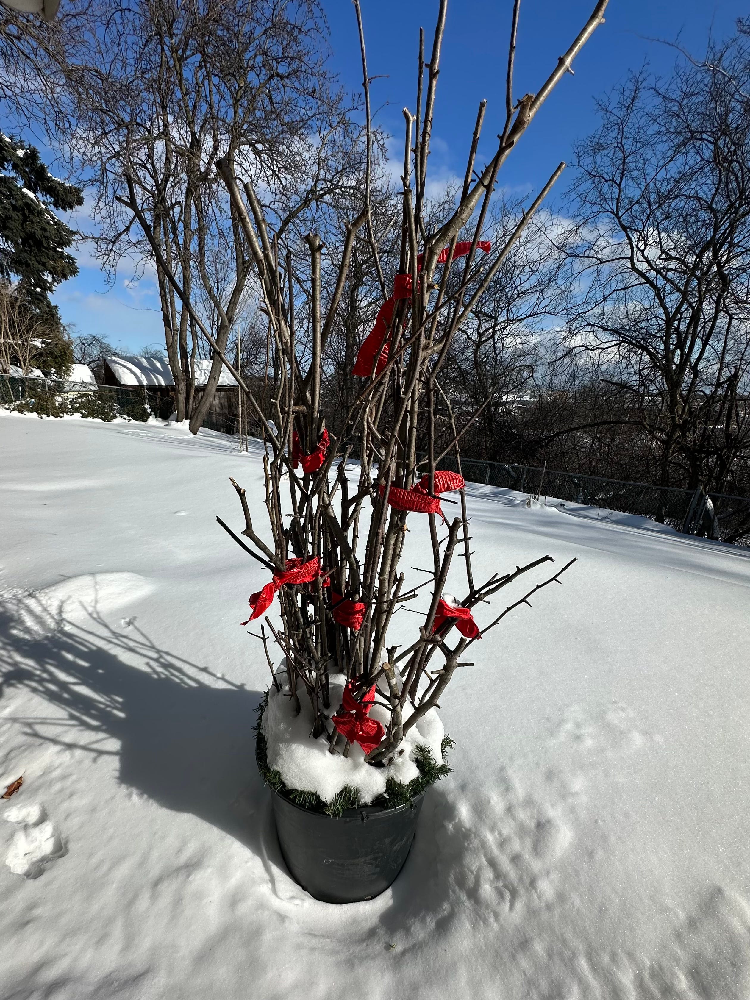 Love that picture! The red ribbons, beautiful snow,bare trees and that gorgeous sky! Your plant looks happy...💜