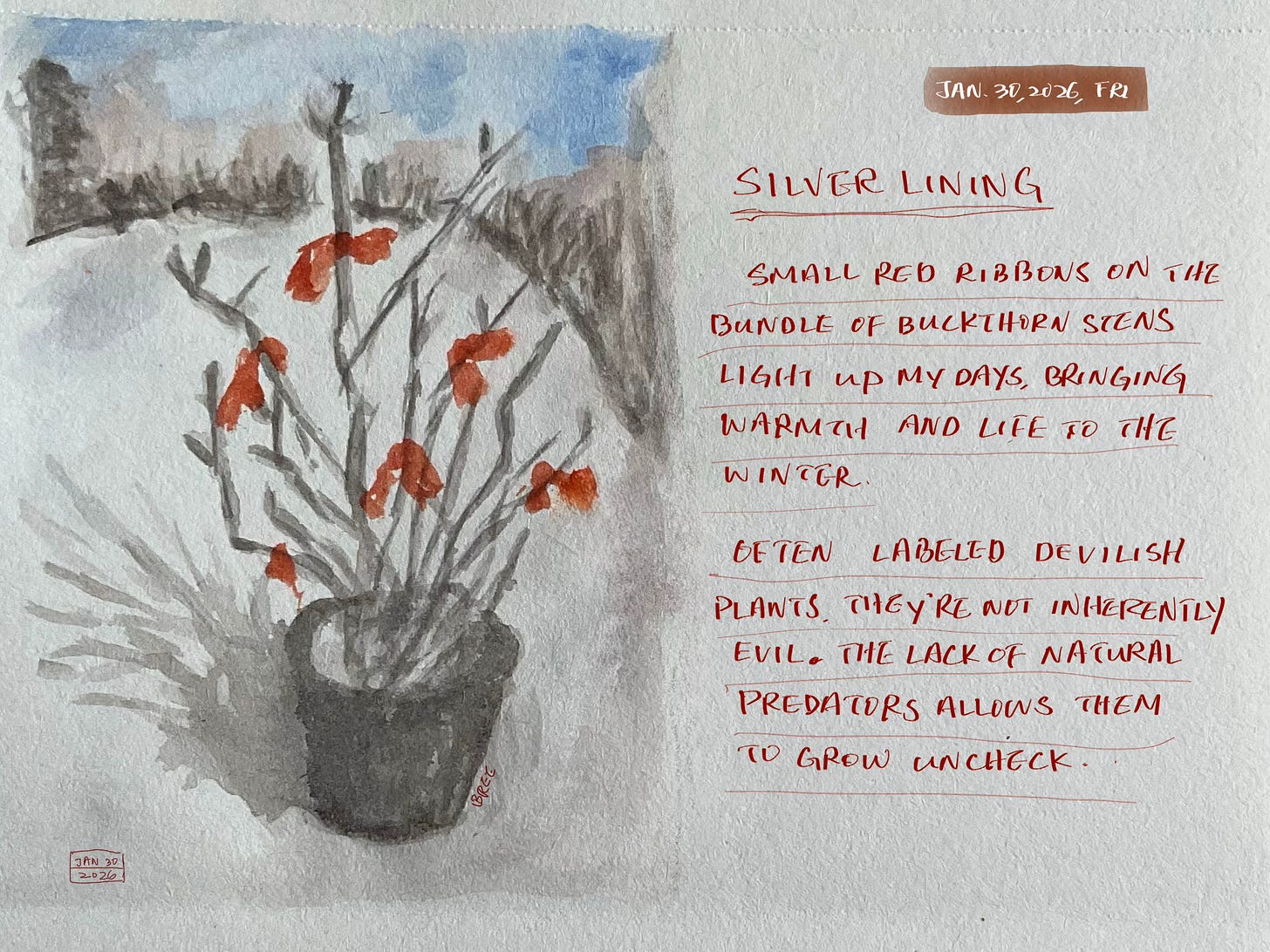 Buckthorn is often labeled a devilish plant, something to be removed at all costs. Once, I saw a pile of buckthorn branches set on fire to prevent berry-bearing stems from taking root again. Burning the stems this way felt brutal to me. The plants themselves are not inherently evil, it’s the absence of natural predators that allows them to spread unchecked.